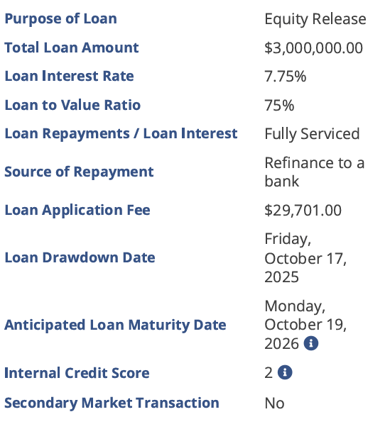 In the example listing, the loan purpose is refinance, the LVR is 70%, and repayment is expected through refinancing to a bank or the sale of the security property. Together, those details help show how the loan is structured and how repayment is expected to occur (remember the loan maturity date is anticipated only and can change).